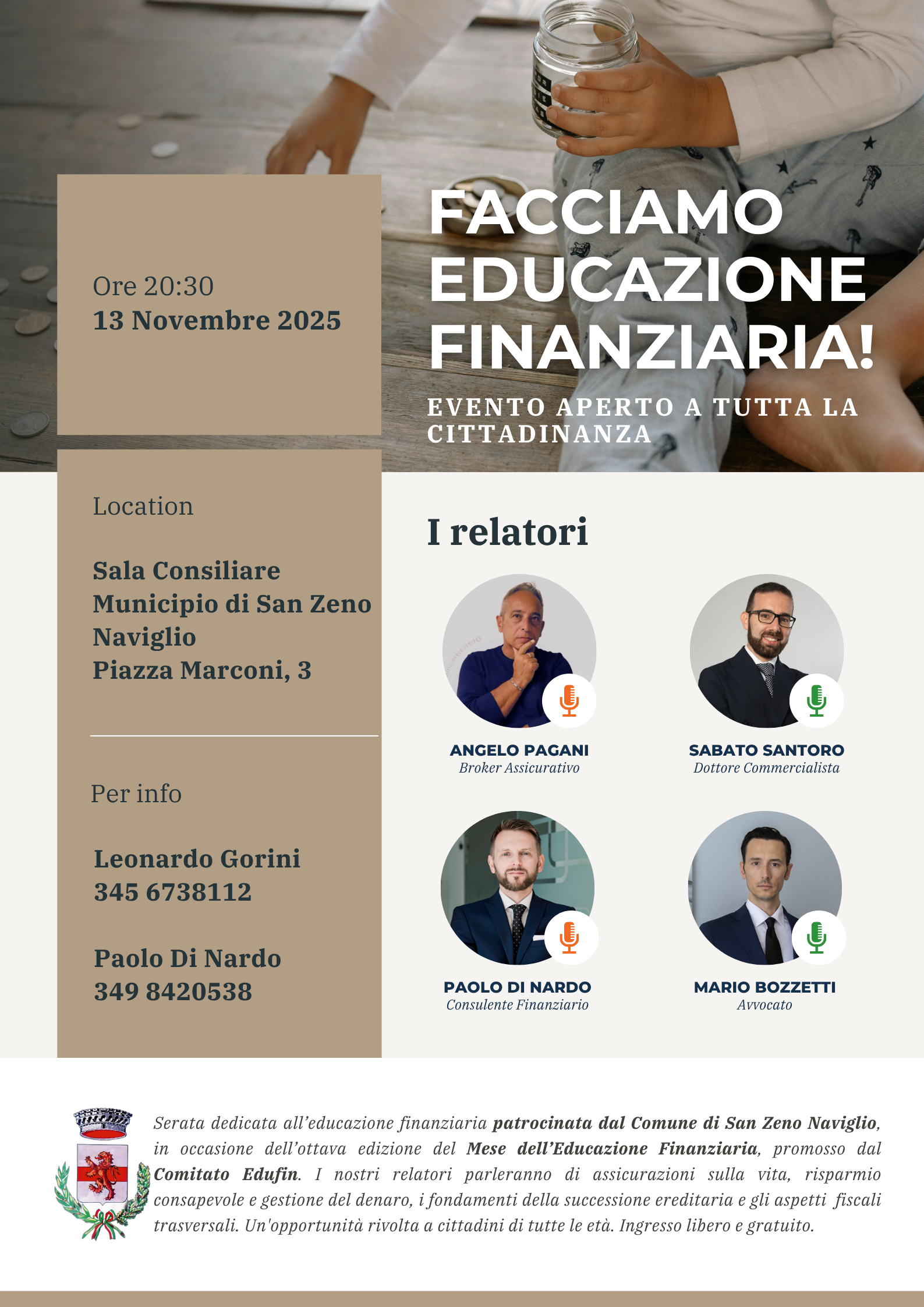 Il Comune di San Zeno Naviglio è lieto di ospitare “Facciamo Educazione Finanziaria!” , un evento gratuito e aperto a tutta la cittadinanza che si terrà giovedì 13 novembre 2025 alle ore 20:30 presso la Sala Consiliare del Municipio (Piazza Marconi, 3) .