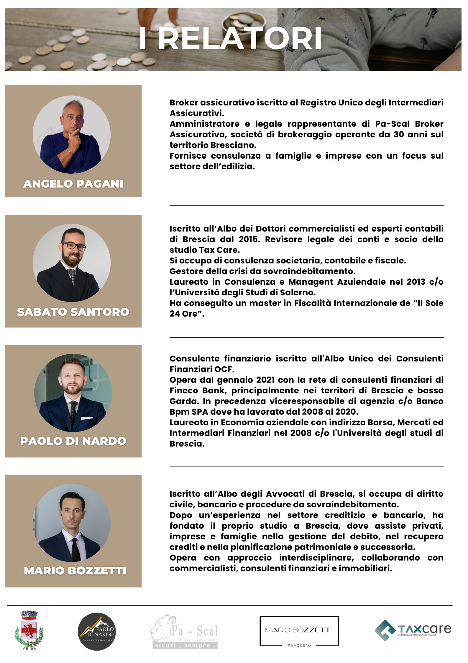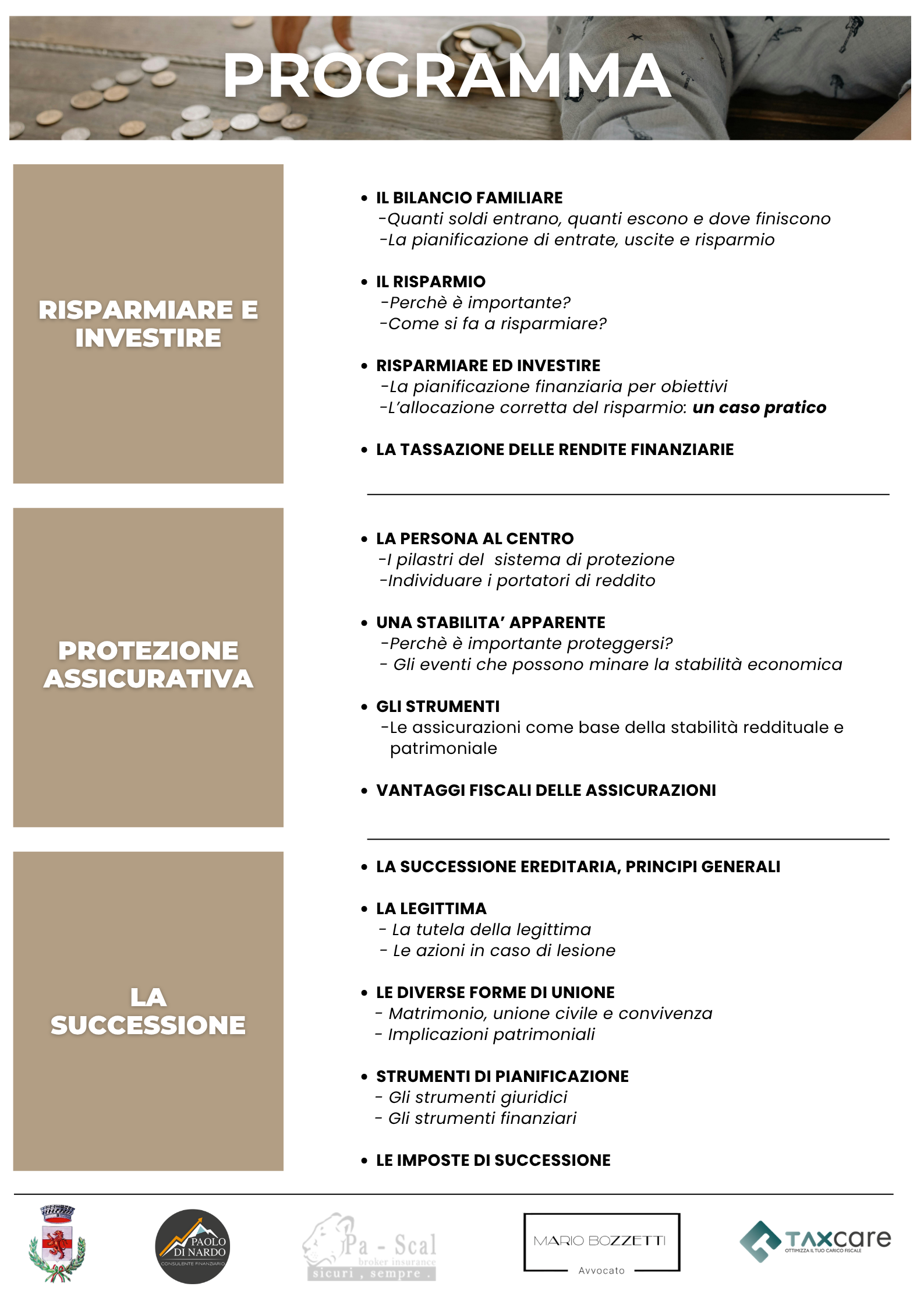 Durante la serata, attraverso casi pratici e un linguaggio accessibile, verranno trattati i temi della tutela economica familiare, dei vantaggi fiscali delle assicurazioni, della corretta gestione del patrimonio e delle imposte di successione.