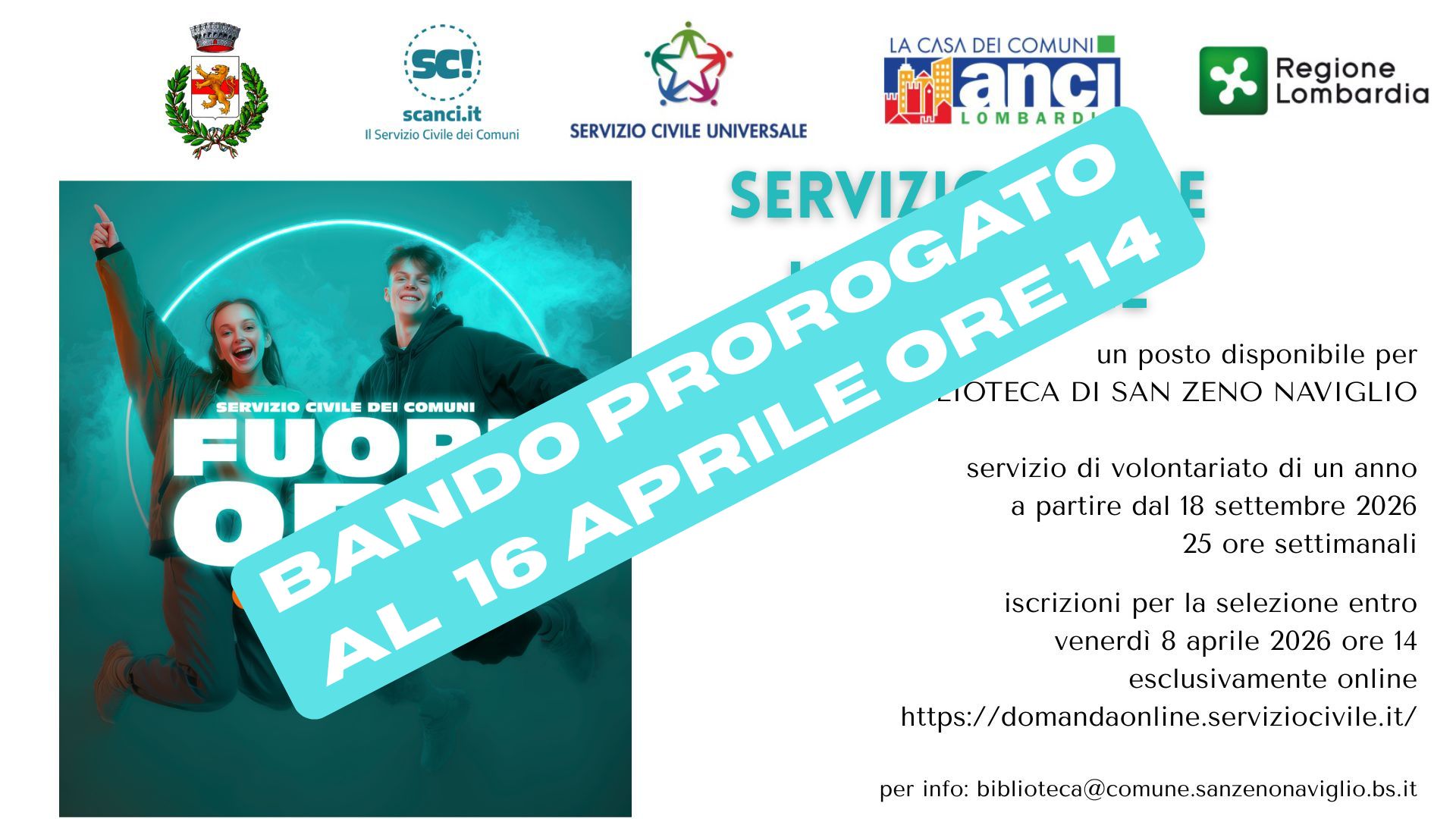 Il Comune di San Zeno Naviglio informa che è attivo il bando per il Servizio Civile Universale 2026, che prevede opportunità di partecipazione per i giovani anche sul territorio comunale.