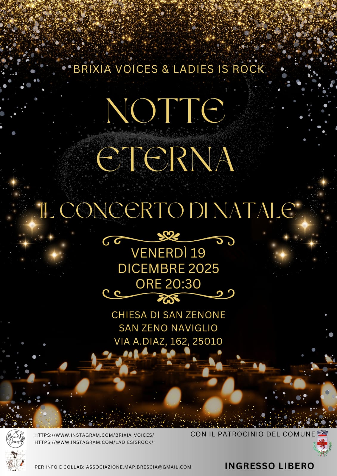 Venerdì 19 dicembre 2025 alle ore 20.30, nella Chiesa Parrocchiale di San Zeno Naviglio in via A. Diaz 162, si terrà il tradizionale concerto di natale denominato "LA NOTTE ETERNA".