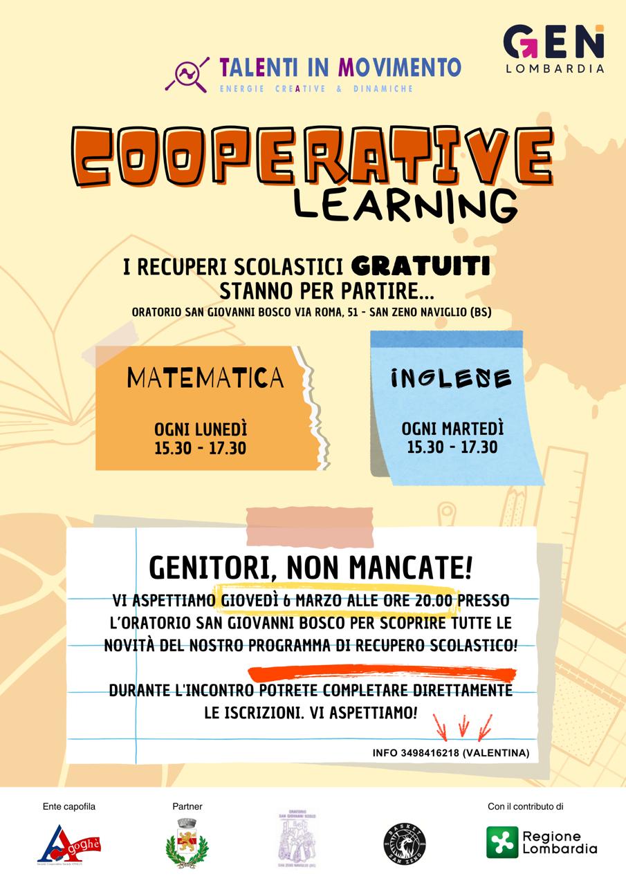 Giovedì 6 Marzo alle ore 20.00 presso l'Oratorio San Giovanni Bosco è previsto un incontro conoscitivo nell'ambito del progetto "Cooperative learning - Recupero scolastico gratuito per ragazze e ragazzi delle scuole superiori."