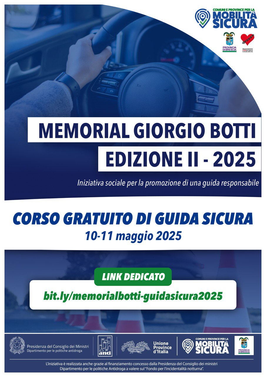 La Provincia di Brescia promuove una serie di iniziative, insieme all’associazione “Condividere la strada della vita”, dedicate alla sicurezza stradale, con particolare riguardo alla prevenzione e per contrastare l’abuso di alcool o l'utilizzo di sostanze stupefacenti. Si tratta di un progetto che rientra nel contesto del Memorial Giorgio Botti (giovane cittadino bresciano tragicamente scomparso in un incidente stradale da semplice passeggero, cui è dedicato questo pacchetto di iniziative), giunto quest’anno alla sua seconda edizione. Il cuore del Memorial Botti è il corso gratuito di guida sicura per i cittadini. Un’opportunità per tutti, giovani e no, di partecipare ad un momento di crescita che stimoli la consapevolezza, promuova la responsabilità e soprattutto prevenga gli incidenti stradali.