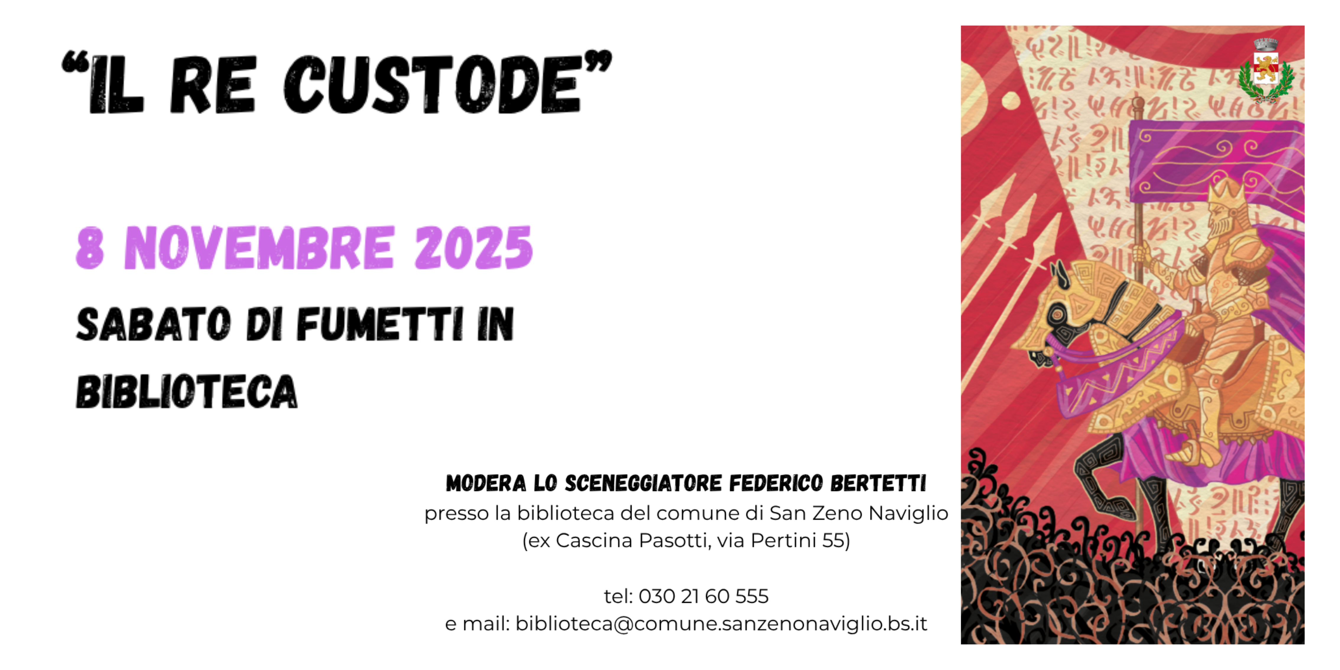 Sabato 8 novembre 2025 la biblioteca comunale di San Zeno Naviglio ospita un evento speciale: “Il Re Custode – Sabato di Fumetti in Biblioteca” , un'iniziativa dedicata a bambini, famiglie e appassionati di fumetto.